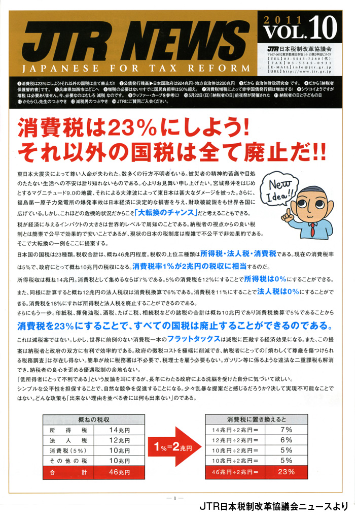 詳しくは、引用した「JTR NEWS」をご覧いただければと思いますが、消費税に着目したフラットタックスの導入です。
