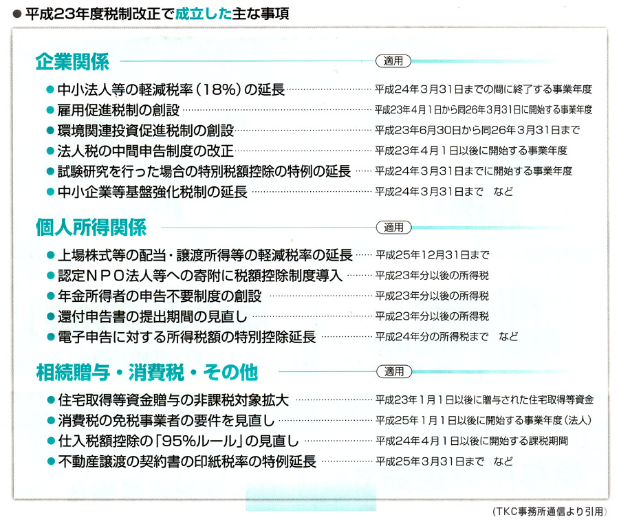 「一体、何が成立したのか良く分からない」という声も少なからずいただくので、今年の総括として、『平成23年度税制改正で成立した事項』を今一度、整理しておきたいと思います。