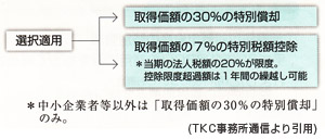 省エネ・CO2排出削減設備や再生可能エネルギー設備等を取得して、取得した日から1年以内に事業用として使った場合、中小企業の場合には、@通常の減価償却+30%の減価償却かA7%の税額控除のいずれかが選択適用できます。