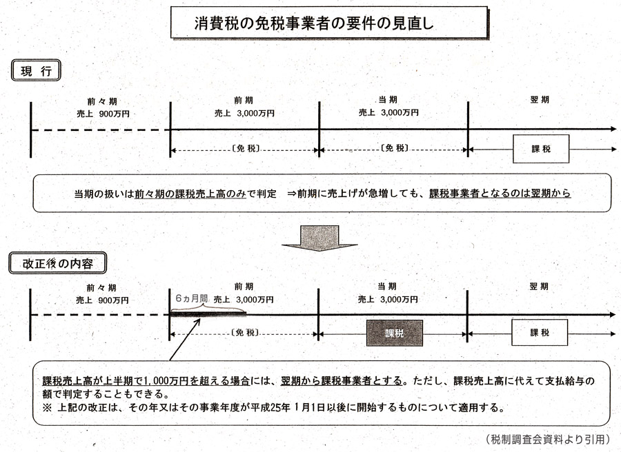 平成25年1月1日以後に開始する課税期間から適用されることになっています。すなわち、6ヶ月という判定期間は、平成24年1月1日から始まることになります。