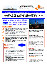 TFSグループが主催する『上海・蘇州 現地視察ツアー』の開催日時が9月16日(日)〜19(水)に決まりました。