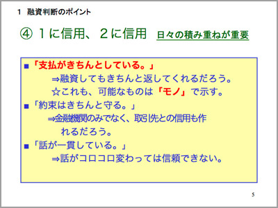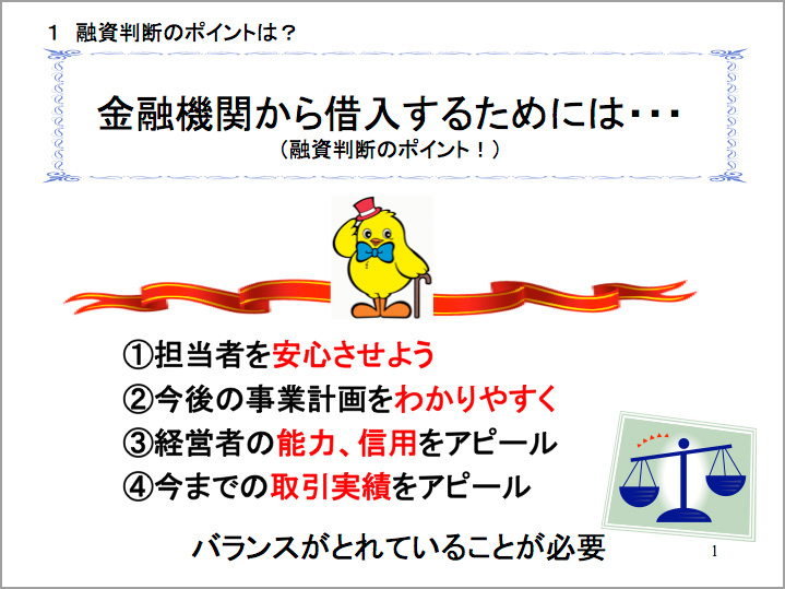 金融機関から借入をするためのポイントとして、最初にあげられたのが、この4点。このバランスがとれていることが必要。