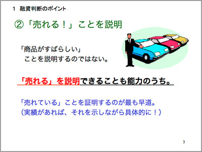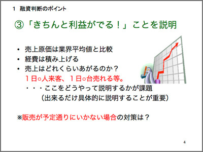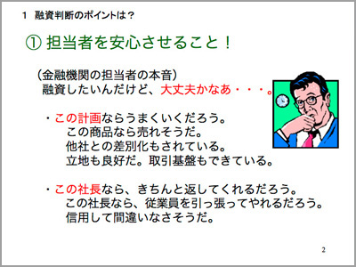 ■融資判断のポイントは? @金融機関の担当者を安心させること! A「売れる!」ことを説明すること! B「きちんと利益が出る!」ことを説明すること! C1に信用、2に信用 商品が素晴らしいことを説明したくなってしまいがちなのですが、そこはグッとこらえて、 「売れること」、または「(既に)売れていること」を説明できること。 私どもTFSでも、資金調達のご相談のケースでは、