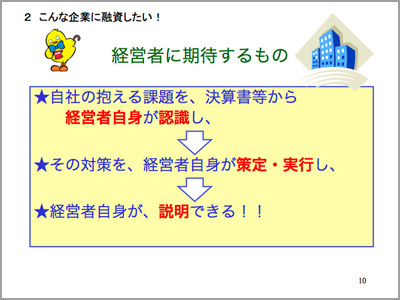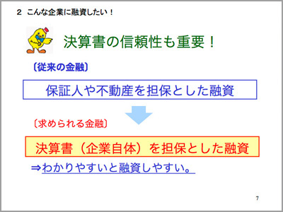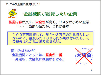 7月26日開催の資金調達力UPセミナーは、2部構成。 第1部は、日本政策金融公庫(旧・国民生活金融公庫)新宿支店の梅谷昌徳・融資課長を講師にお招きして、「融資判断のポイント」についてお話いただきました。 A今後の事業計画をわかりやすく B経営者の能力、信用をアピール C今までの取引実績をアピール