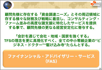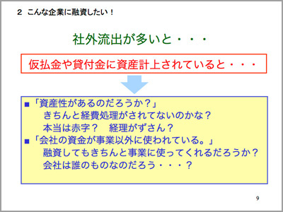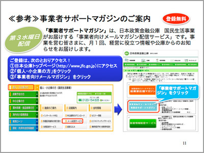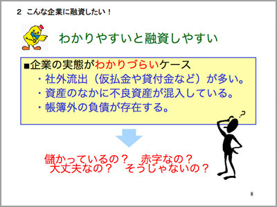 ■こんな企業に融資したい! @金融機関が融資したい企業 Aわかりやすいと融資しやすい B仮払金や貸付金が計上されていると・・・とても不安に C経営者に期待するもの 私どもTFSは、決算の都度、決算診断書を作成して関与先様にご説明することを標準業務としています。時に、経営者のみならず、株主総会、取締役会、経営会議、営業会議等で説明を・・・とのご要請もあります。 最後に、日本政策金融公庫が月1回発行する「事業者サポートマガジン」のご案内もありました。どうぞこの機会に、登録してみてください。