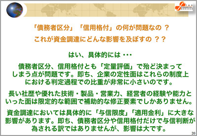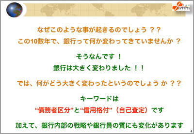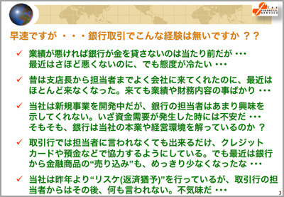 それに加えて、平成21年12月、亀井静香・金融担当大臣の肝いりでスタートした「中小企業金融円滑化法」が、平成25年3月31日で期限切れを迎えます。 平成25年3月31日の期限切れを見据えて、まさに今から“Xデー”に備えておかなければなりません。