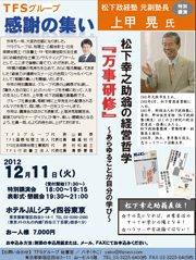 12月11日開催の『TFSグループ感謝の集い』では、これまでのセミナー総括も含めて、上甲晃先生(松下政経塾元副塾長)の基調講演とともに、様々なサプライズも用意して、多くの顧問先様に感謝の気持ちをお届けしたいと思っています。
